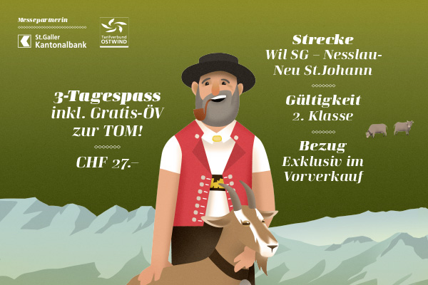 Mit dem neuen 3-Tagespass kostenlos und bequem mit dem öffentlichen Verkehr an die Toggenburger Messe – ganz ohne Parkplatzsuche und ohne zusätzliche Kosten für die Anreise. Der ÖV ist im Ticket inklusive und gilt während der gesamten Messedauer für maximale Flexibilität. Der Pass ist gültig vom 1.–3. Mai 2026 und deckt die Strecke zwischen Wil SG und Nesslau-Neu St. Johann sowie einen Teil des Neckertals (Ostwind-Zonen 364, 365, 366, 915, 916, 974, 975) in der 2. Klasse ab. Der Ticketpreis beträgt CHF 27.– für den 3-Tagespass inklusive ÖV-Ticket, und das Ticket ist ausschliesslich im Vorverkauf erhältlich.